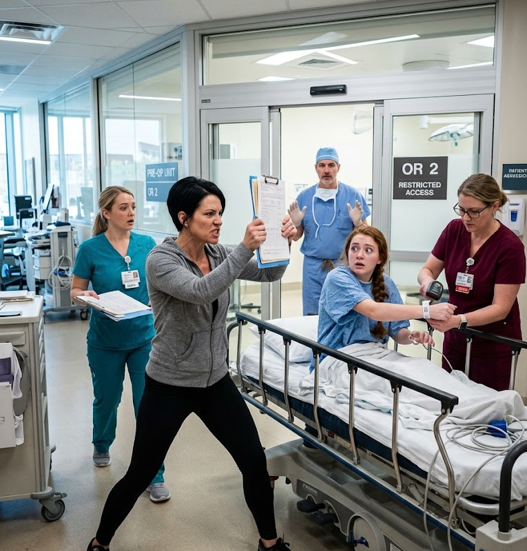 I WAS LITERALLY NEXT IN LINE FOR SURGERY—THE NURSE HAD MY CHART IN HER HAND, THE OPERATING DOORS WERE OPEN, AND I COULD SEE THE WHITE LIGHTS INSIDE—WHEN MY STEPMOM STEPPED IN FRONT OF ME AND SAID, CALM AS ICE, “YOU CAN’T OPERATE ON HER.” EVERYONE FROZE… UNTIL SHE POINTED AT ONE TINY DETAIL IN MY FILE THAT DIDN’T MATCH, THEN AN ALLERGY I’VE NEVER HAD, THEN A CONSENT SIGNATURE THAT WASN’T MINE. AND IN SECONDS, THE NURSES FOUND THE UNTHINKABLE: TWO GIRLS IN THE SAME HOSPITAL, SAME AGE, ALMOST THE SAME NAME, BOOKED BACK-TO-BACK… AND THE WRISTBAND ON MY ARM BELONGED TO THE OTHER ONE. THAT’S WHEN THE SURGEON WALKED IN, LOOKED AT THE PAPERWORK, WENT WHITE, AND SAID WORDS I STILL CAN’T FORGET—BECAUSE IF CARLA HADN’T SPOKEN UP WHEN SHE DID, I WOULD’VE WOKEN UP AFTER A PROCEDURE I WAS NEVER SUPPOSED TO HAVE… OR MAYBE NOT WOKEN UP AT ALL… – Part 2